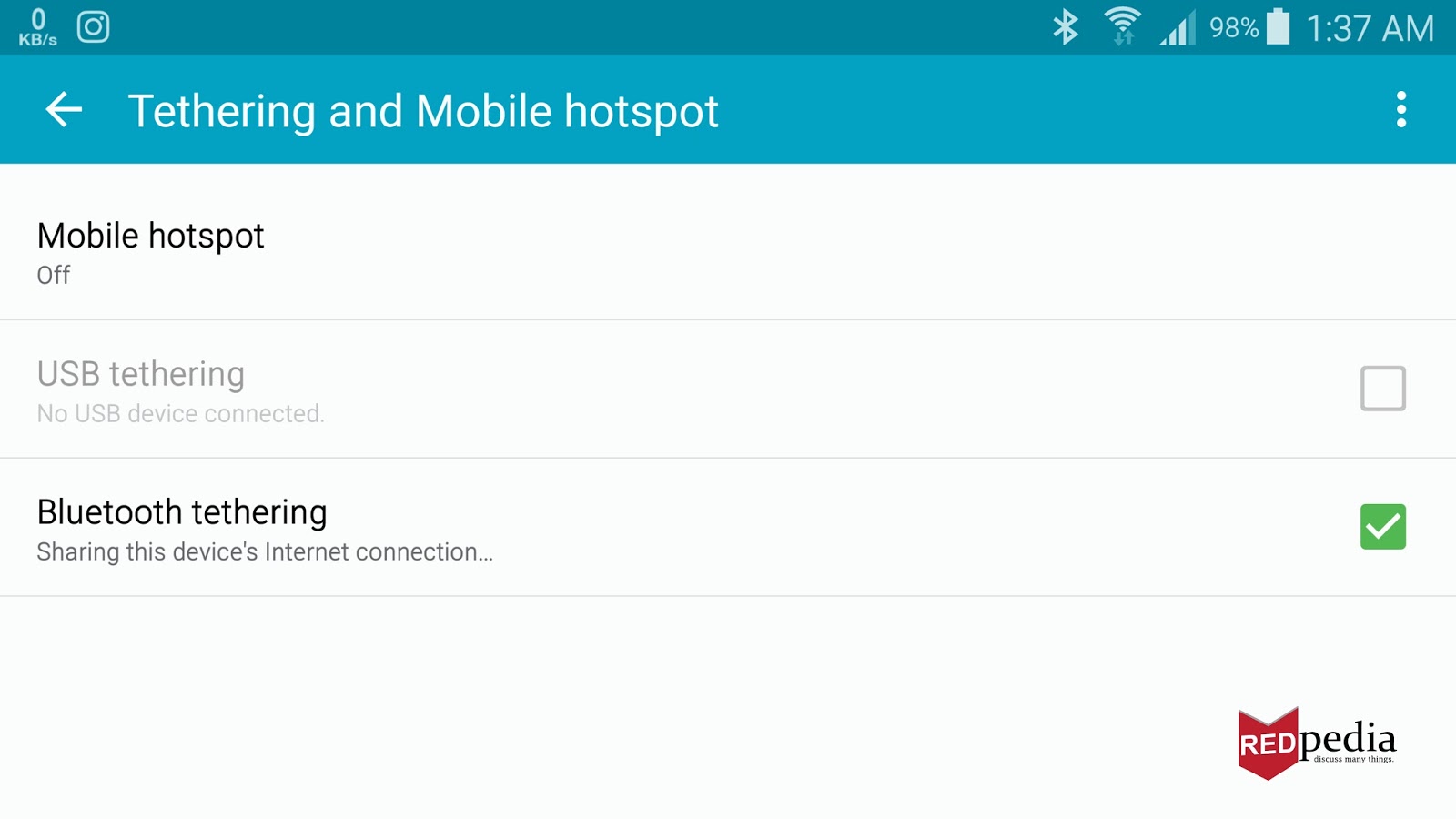 Kemudian atur agar ponsel kita agar melakukan tethering melalui bluetooth. Caranya masuk ke menu Setting lalu pilih opsi Tethering and Mobile hotspot. Untuk mengaktifkan fitur tethering via bluetooth cukup aktifkan dengan menyentuh opsi Bluetooth tethering, sehingga jiika sudah aktif akan muncul tanda centang disampingnya.