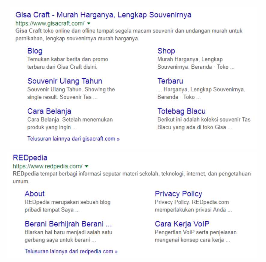 Terlihat perbedaannya, dimana Gisa Craft lebih condong mendapatkan sitelink yang benar-benar merupakan menu navigasi di dalam situsnya. Sedangkan REDpedia.com mendapatkan sitelink yang berupa navigasi dan artikel. Ini sangat wajar karena kita tidak bisa menentukan mana yang akan tampil sebagai sitelink dan algoritma Google yang menentukannya.